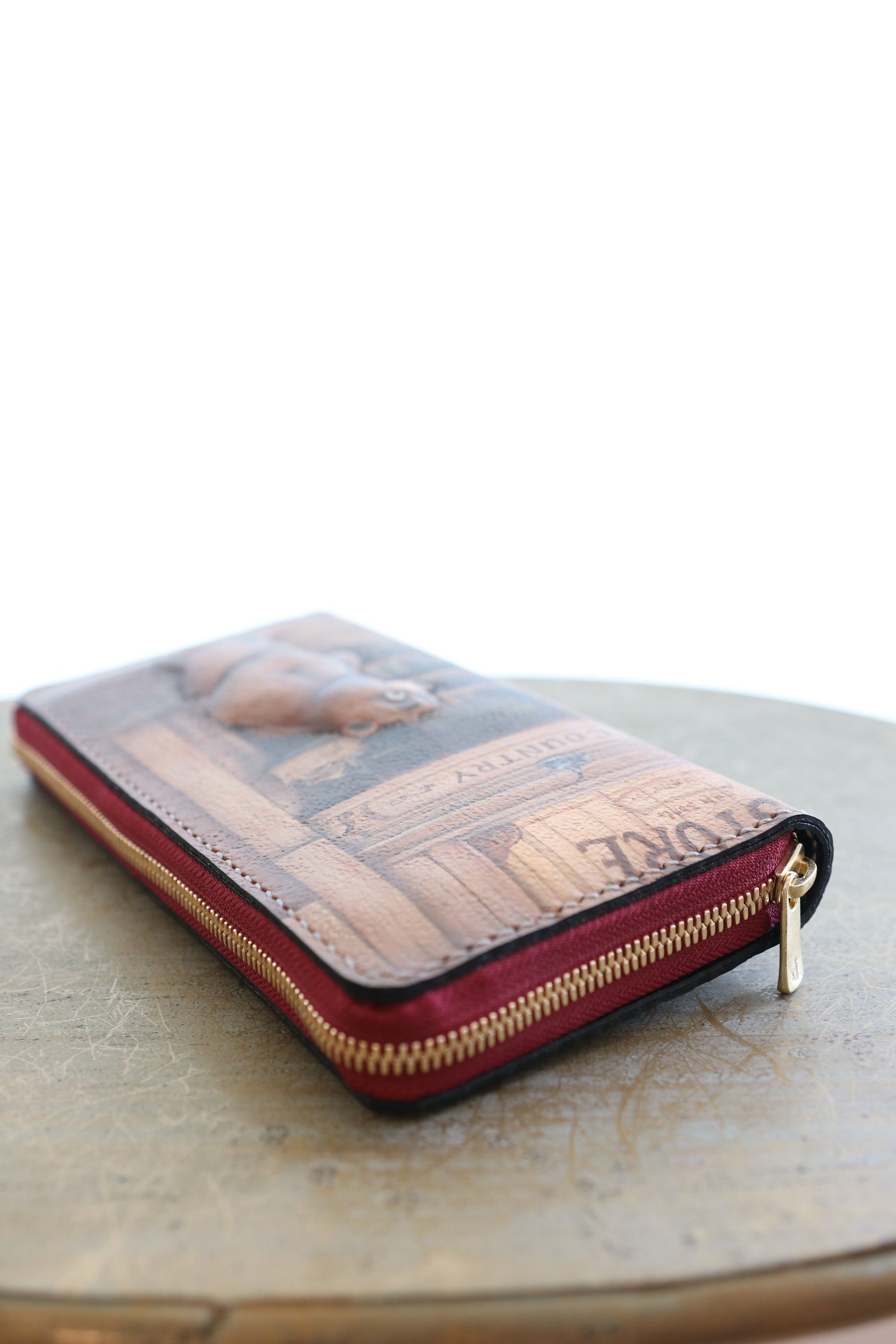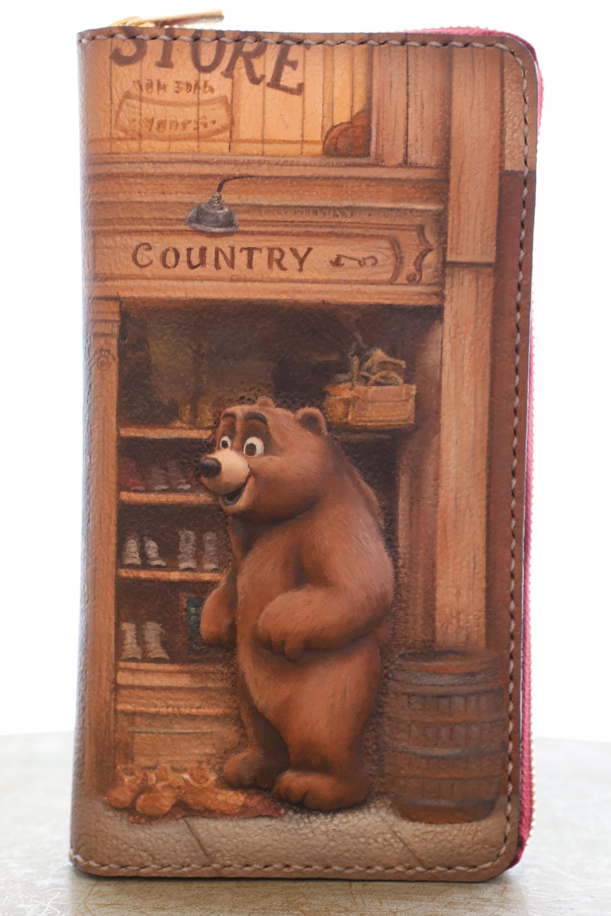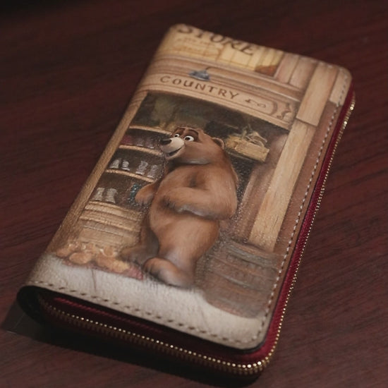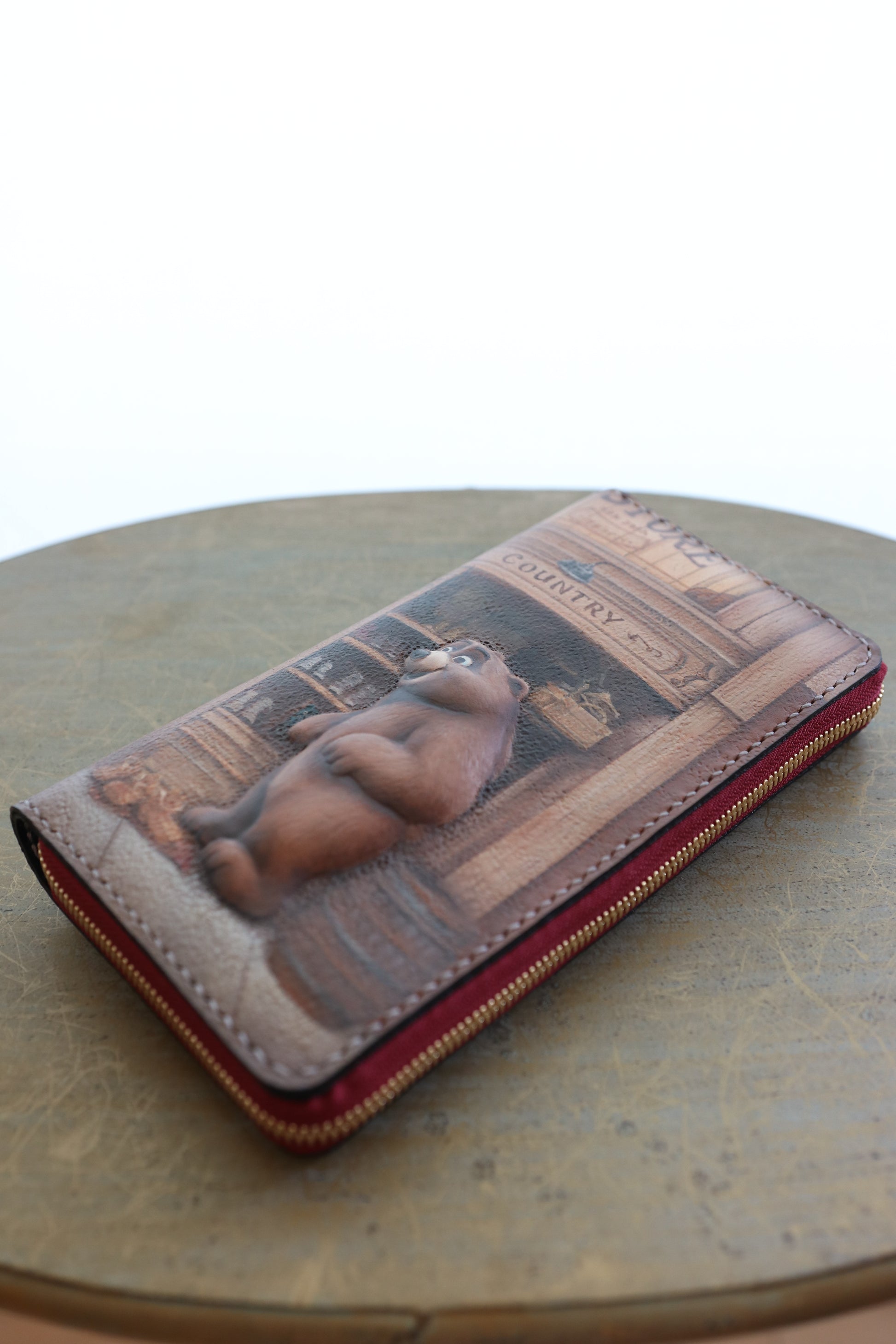 牛革を立体成型してセレクトショップで店頭に立って店番をしているクマを表現しました。ハンドペイント、手縫いで丁寧に仕上げたラウンドファスナータイプの長財布です。ウッド長のカントリーの世界でなにを販売してくれるのでしょうか。ナチュラルなベージュ系のグラデーションに仕上げました。かわいらしさの中にも奥行きの深い背景が描かれています。高級感のあるワイン×ゴールドのファスナーもいいアクセントになっています。