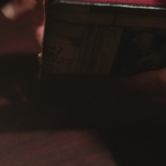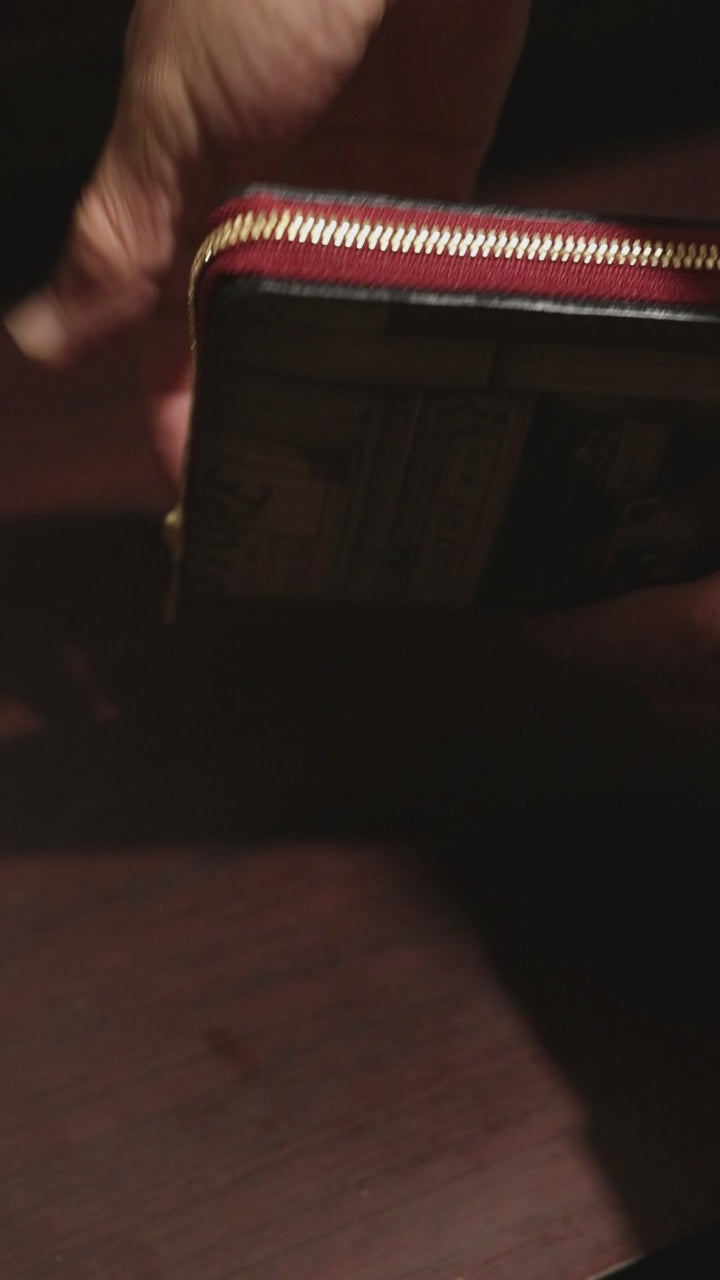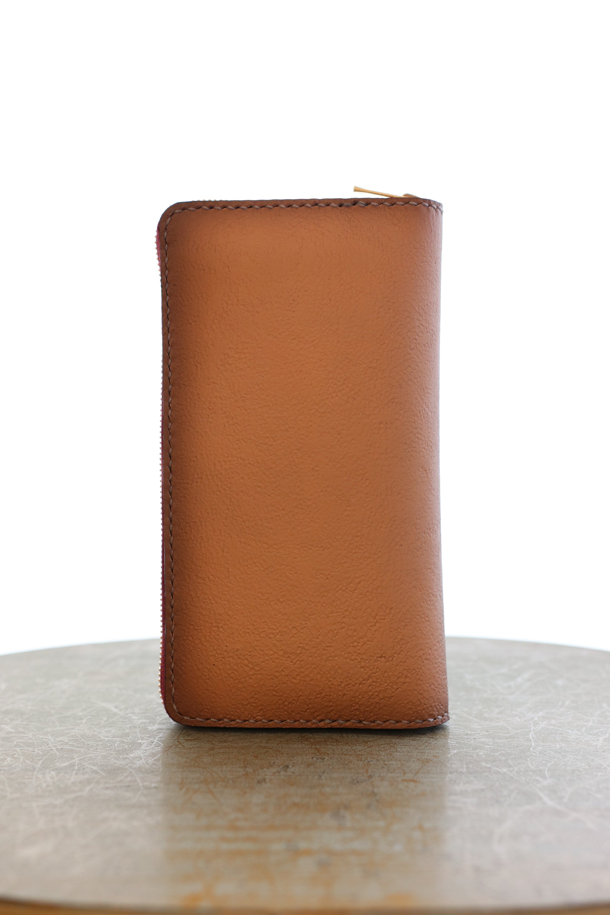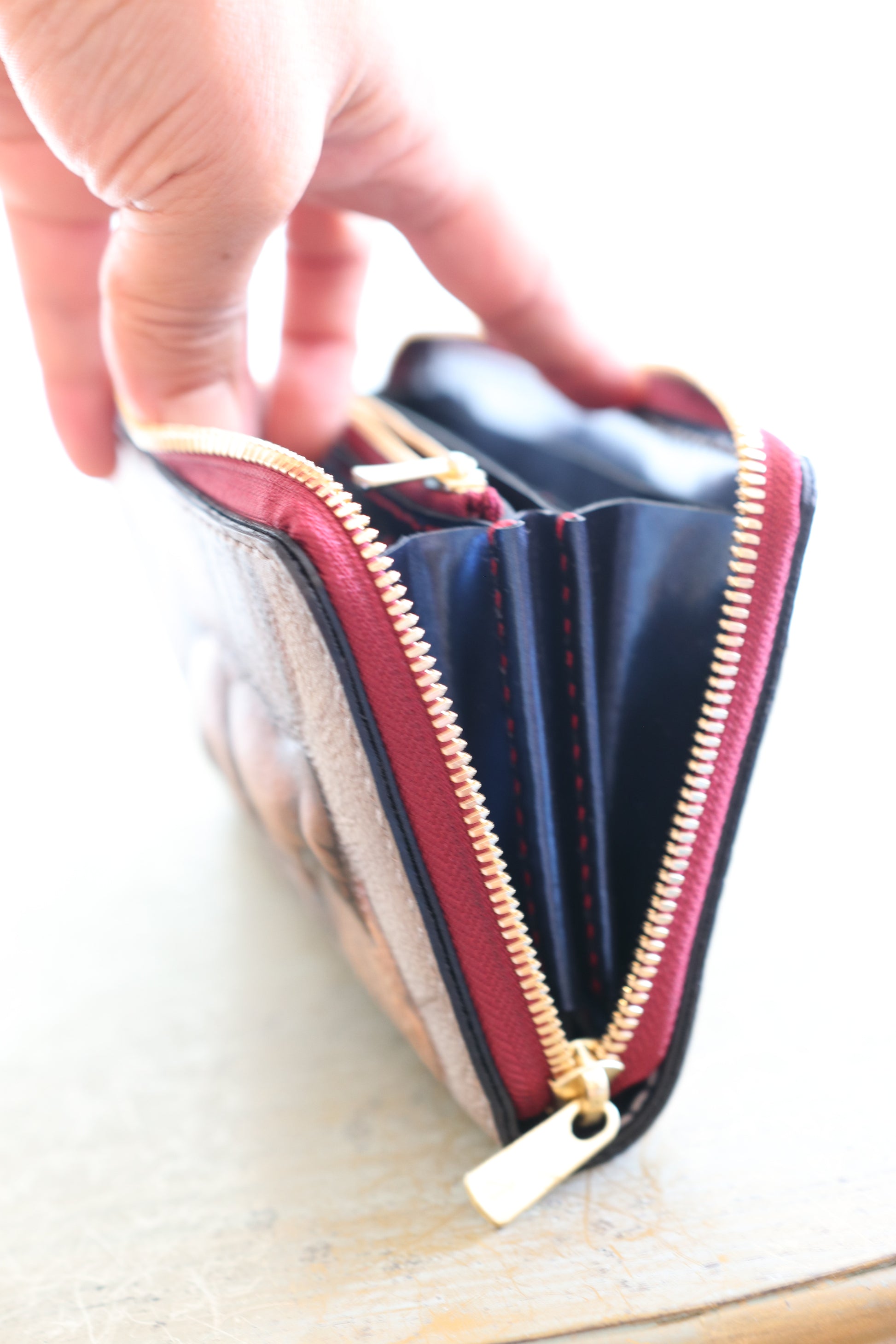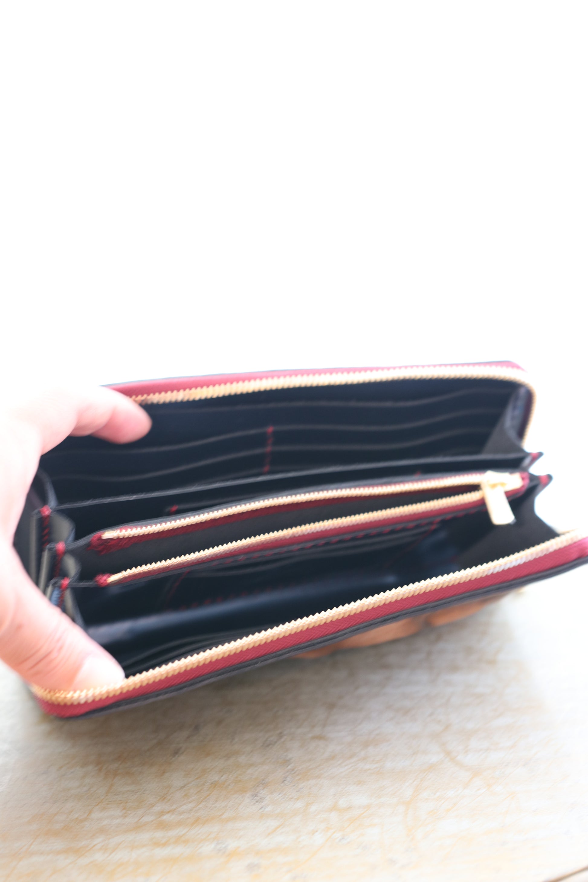 牛革を立体成型してセレクトショップで店頭に立って店番をしているクマを表現しました。ハンドペイント、手縫いで丁寧に仕上げたラウンドファスナータイプの長財布です。ウッド長のカントリーの世界でなにを販売してくれるのでしょうか。ナチュラルなベージュ系のグラデーションに仕上げました。かわいらしさの中にも奥行きの深い背景が描かれています。高級感のあるワイン×ゴールドのファスナーもいいアクセントになっています。