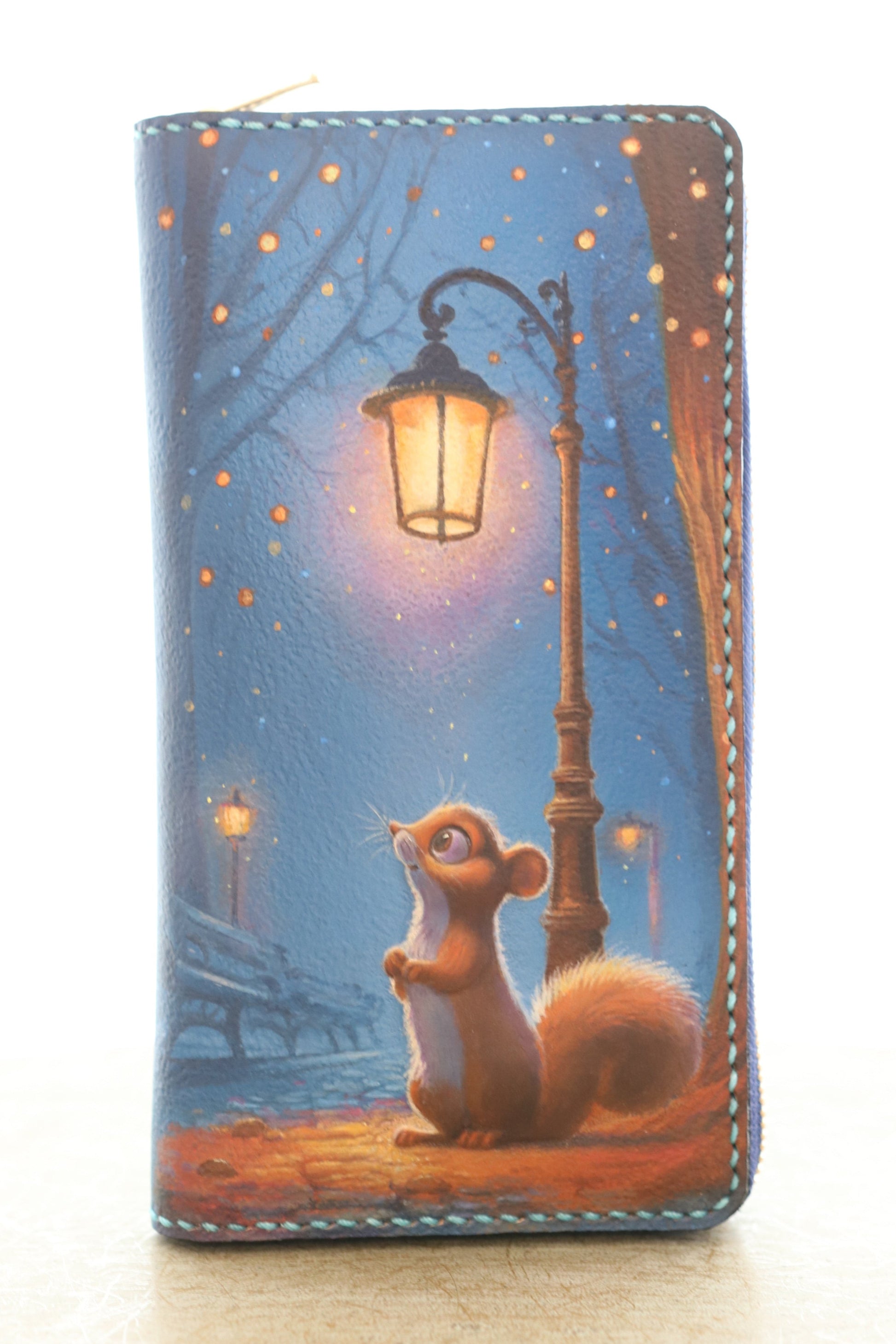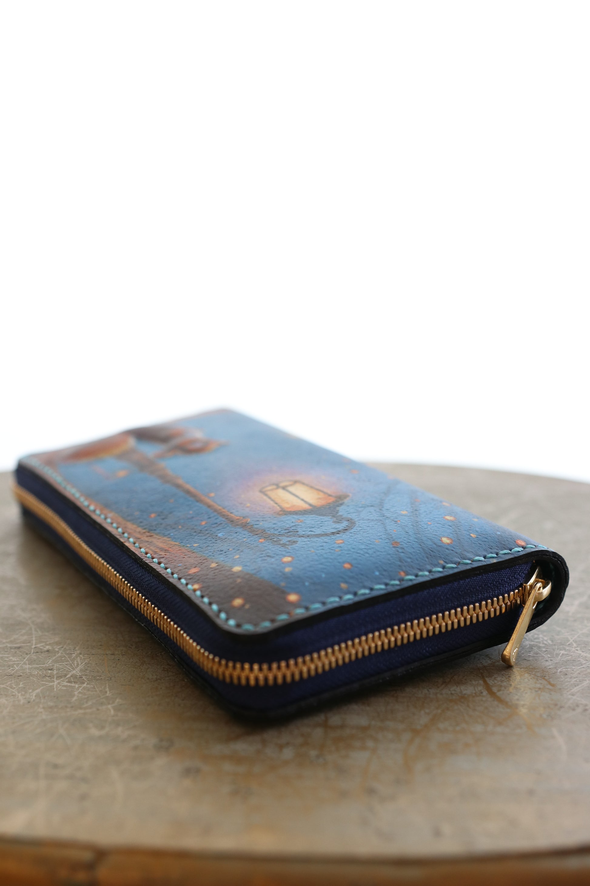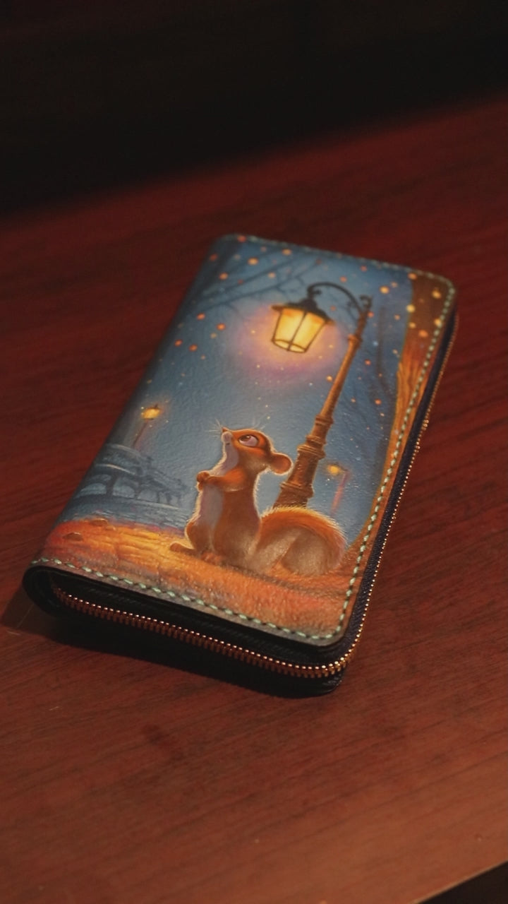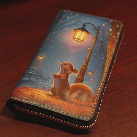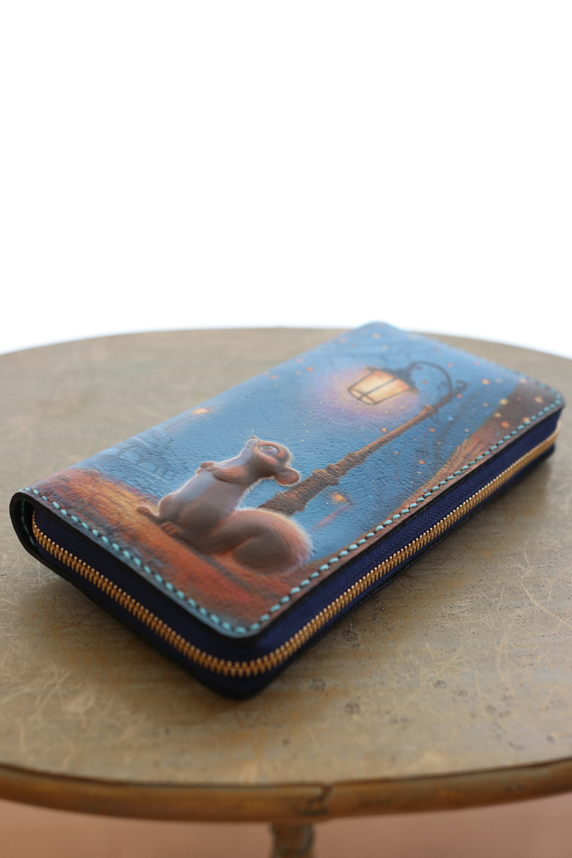 牛革を立体成型して夜空を見上げるリスを表現しました。ハンドペイント、手縫いで丁寧に仕上げたラウンドファスナータイプの長財布です。静かな夜、街灯の下に立つリスは星空に願い事をしているのでしょうか。ブルーグラデーションが美しい作品になっています。高級感のあるネイビー×ゴールドのファスナーもいいアクセントになっています。
