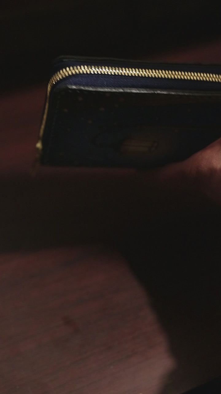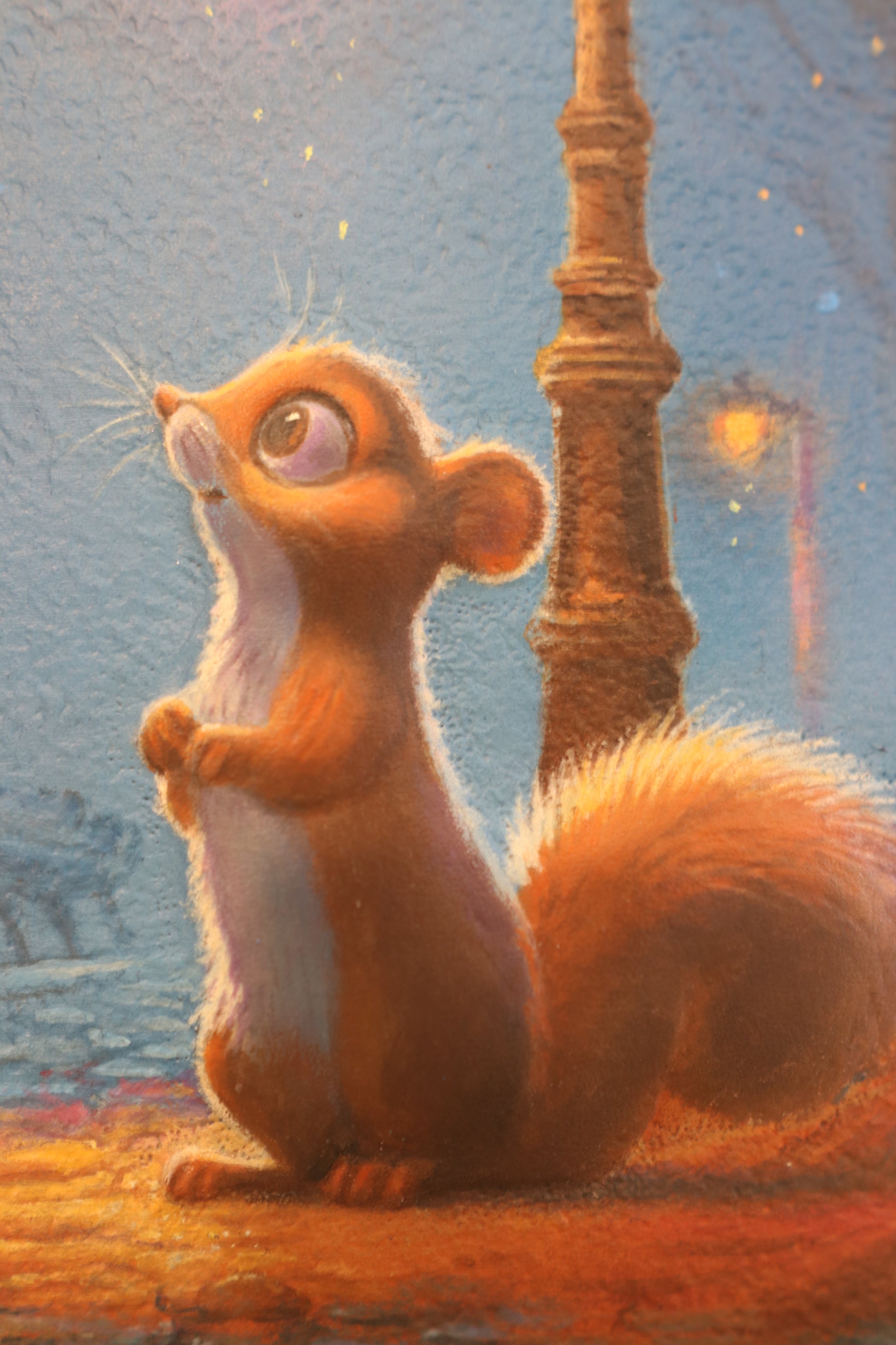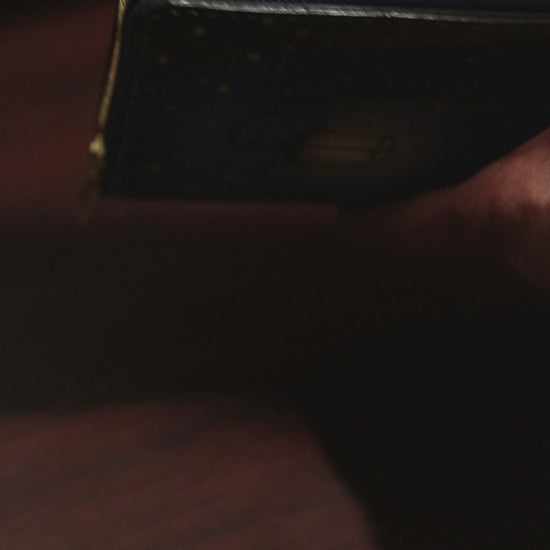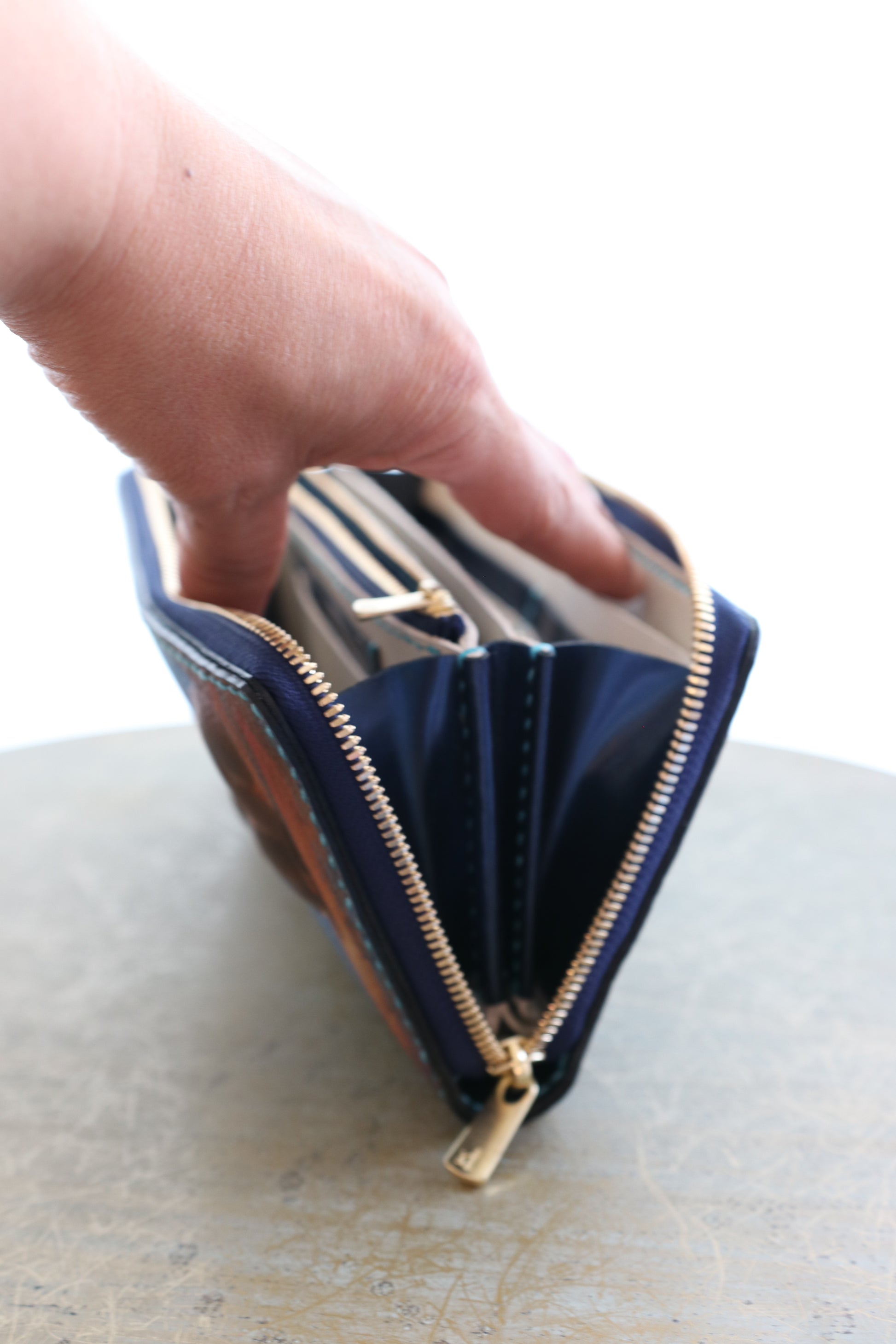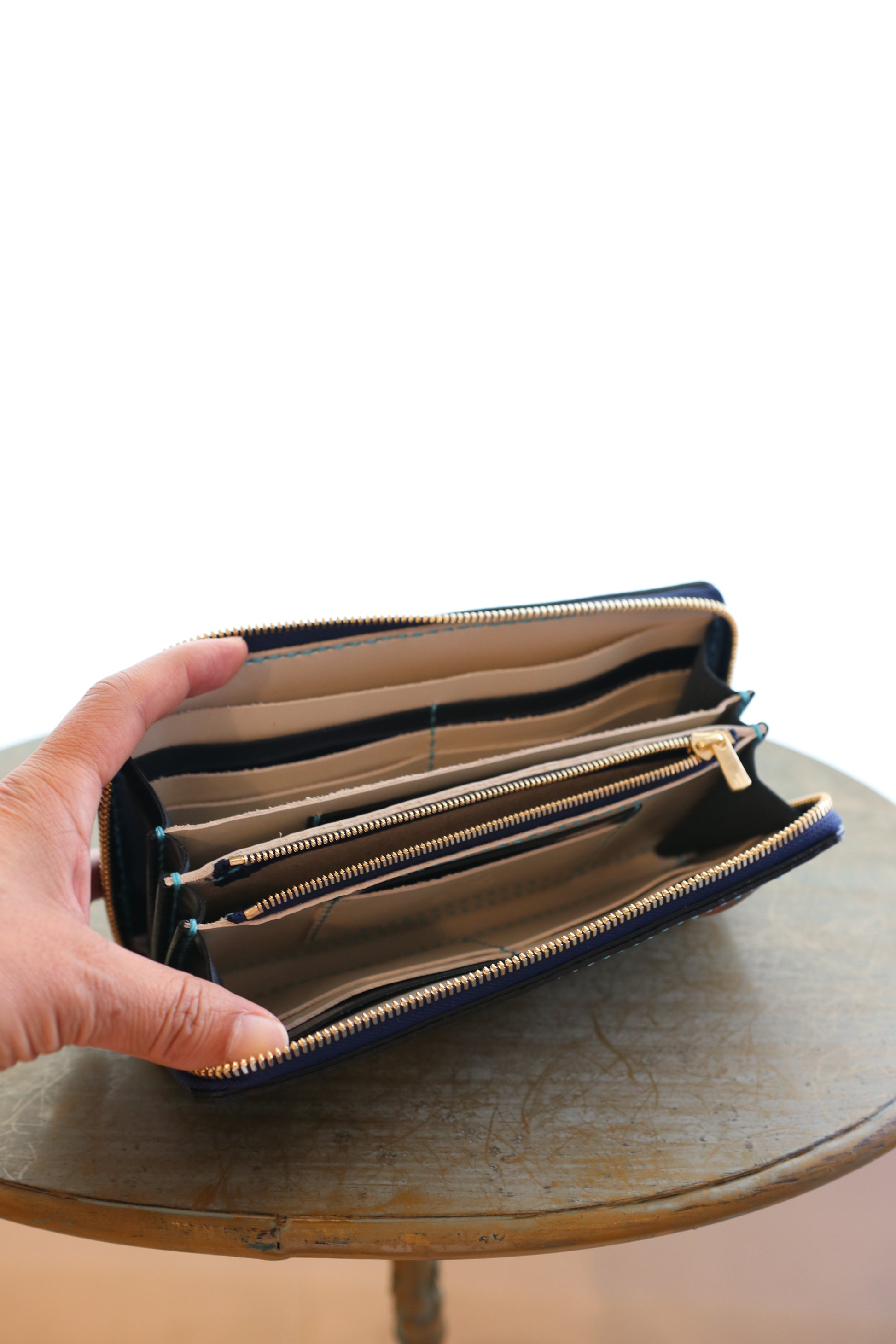 牛革を立体成型して夜空を見上げるリスを表現しました。ハンドペイント、手縫いで丁寧に仕上げたラウンドファスナータイプの長財布です。静かな夜、街灯の下に立つリスは星空に願い事をしているのでしょうか。ブルーグラデーションが美しい作品になっています。高級感のあるネイビー×ゴールドのファスナーもいいアクセントになっています。